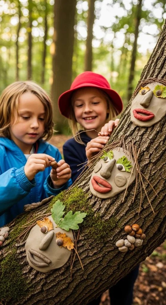 Tree faces are one of the most imaginative nature crafts because they make the outdoors feel alive. Give kids a small piece of clay or play dough and let them press it gently onto the bark of a tree to form eyes, noses, mouths, and eyebrows. Then use twigs, acorns, leaves, seeds, and grass to add extra details like hair, ears, eyelashes, or funny mustaches. This craft feels magical because children get to “discover” a face hiding in the tree. It also encourages close observation since they start noticing bark patterns, cracks, and shapes that can become part of the expression. If you want to keep it very simple, skip the clay and make temporary faces from mud and found materials. A good tip is to remind kids to be gentle and use only a small amount so the tree is not disturbed. This idea works best in a garden, yard, or park with sturdy trunks and lots of loose natural materials nearby. It is a strong choice for imaginative children because it feels like crafting, building, and storytelling all at once.