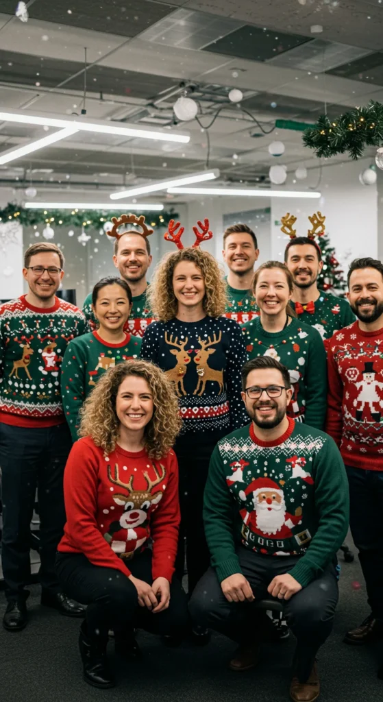 Host an ugly sweater day and let everyone show off their most ridiculous outfit. Create categories like “Funniest,” “Most Festive,” or “Best DIY.” Offer small prizes like chocolates or a coffee voucher. You can even schedule a mini runway walk for laughs. Encourage employees to upcycle old sweaters with glue, pom-poms, and felt. It’s a hilarious, low-cost way to bring everyone together.