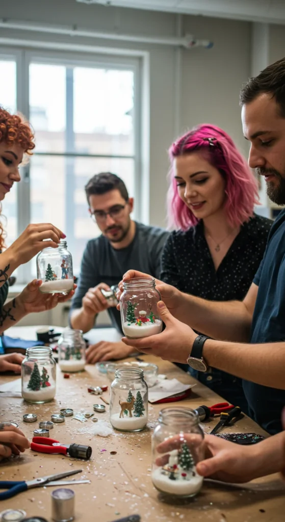 Turn a table into a snow globe workshop. All you need are jars, glitter, glycerin, and small figurines. Everyone gets a keepsake to take home.