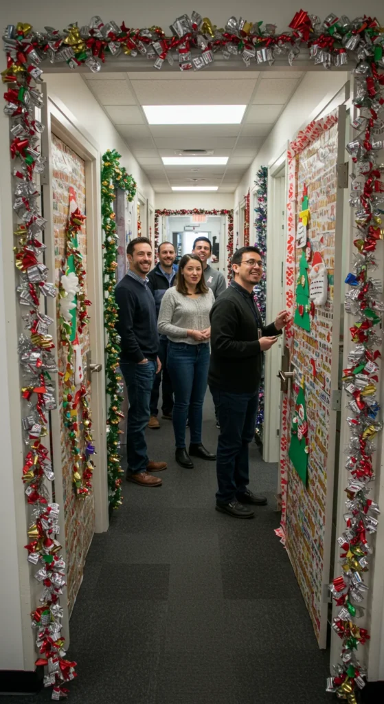Turn your workplace into a decorating competition. Give each team a door or cubicle to transform. Wrapping paper, garlands, and lights work wonders. You can pick themes like “Winter Wonderland” or “Santa’s Workshop.” Vote for the best door and offer a small treat basket as a prize. It boosts creativity and gets everyone laughing while walking through the office.