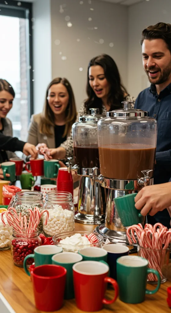 A hot chocolate bar makes any office feel cozier. Set up a table with mugs, cocoa mix, and toppings like crushed candy canes, caramel syrup, and marshmallows. Use thermoses or slow cookers to keep drinks warm. Add a holiday playlist in the background for atmosphere. It’s affordable, quick to set up, and keeps everyone smiling during work breaks.