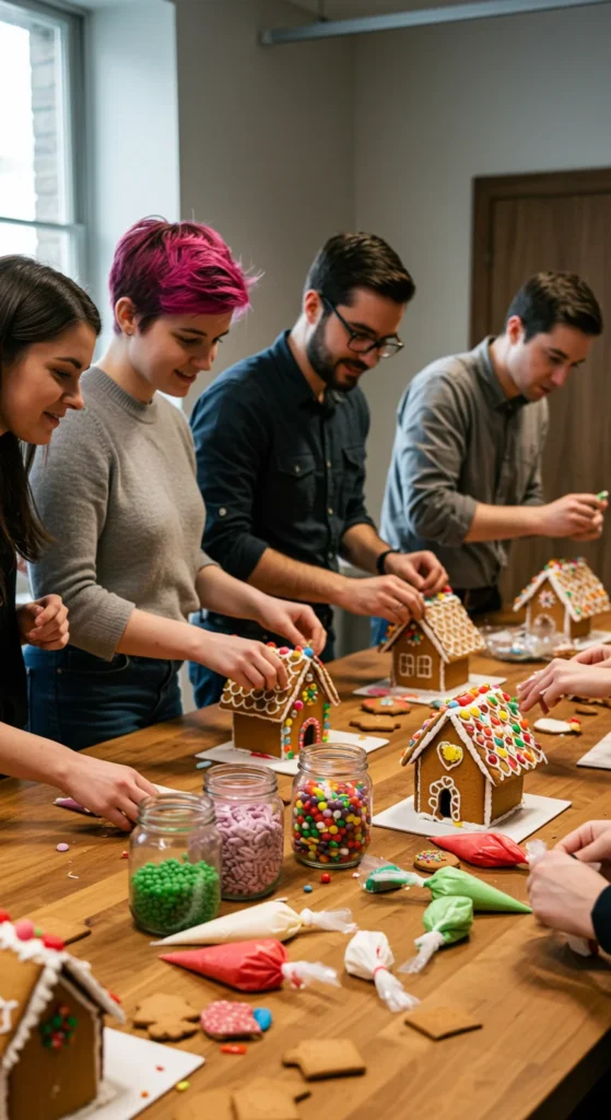 Host a gingerbread house contest using kits or homemade pieces. Split into small teams and give a time limit. Add themes like “Santa’s Village” or “Holiday Mansion.” Display the finished houses in the break room and let everyone vote for their favorite. It’s fun, hands-on, and looks great for photos.