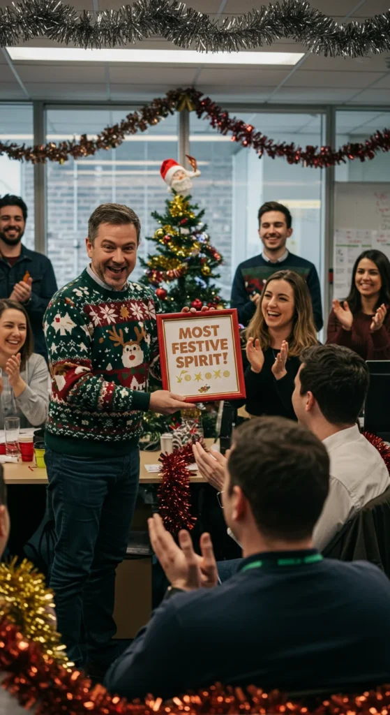 End the season with lighthearted office awards. Categories like “Most Cheerful,” “Best Desk Décor,” or “Santa’s Helper” keep it fun. Print simple certificates and make it a mini event.