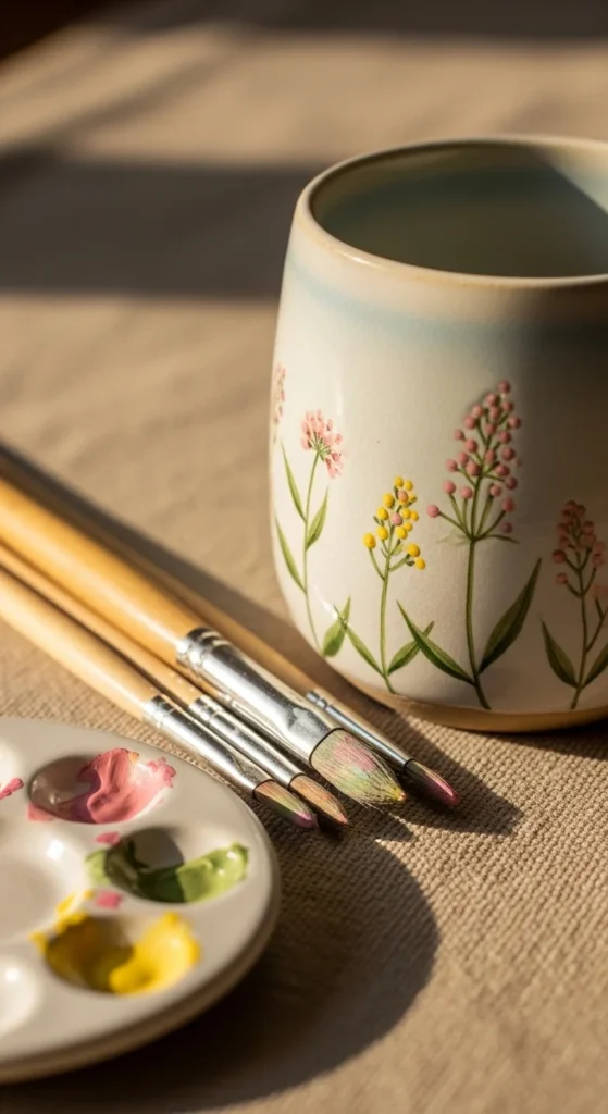 A wildflower mug is a lovely place to start because it looks detailed without being hard to paint. You do not need perfect lines, and small stems, tiny petals, and scattered dots already create a soft handmade look. Use a light base color, then add simple flowers in two or three shades so the design stays easy to manage. This idea is budget-friendly because you only need a thin brush and a few paint colors. A white or cream mug works especially well. Try yellow daisies, pink buds, or little lavender sprigs. If you feel nervous, sketch a few stems with pencil first, then paint over them slowly. This style also works well for gifts because a floral mug feels thoughtful for birthdays, Mother’s Day, or a simple thank-you present. You can even paint flowers around only the rim or handle if you want a lighter design. For a cozy finish, leave a little empty space between clusters so the flowers stand out. If one petal looks uneven, it usually adds charm instead of ruining the piece, because handmade pottery often looks better when it feels slightly imperfect and real.