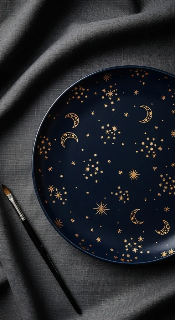 A moon and stars dessert plate is perfect when you want a magical design that still feels easy to paint. Start with a dark base like deep blue, charcoal, or plum, then add tiny stars, dots, and a crescent moon in white or a metallic-look paint meant for ceramics. The beauty of this idea is that it does not need strict symmetry. Random little stars and soft dot clusters already create a night-sky effect. This keeps the design beginner-friendly and affordable because you can make it with just a few shades. A small dessert plate is the perfect size for this project because the design feels special without becoming too large or time-consuming. It also works well as a gift for someone who likes astrology, dreamy decor, or celestial themes. If you want a softer version, use a white plate with blue stars instead of a dark background. If you want more detail, add little clouds, constellations, or a ring of tiny dots around the rim. Keep the center simple so it still feels usable. This plate works as decor, but it is also lovely for cookies, cake slices, or a small evening tea setup.