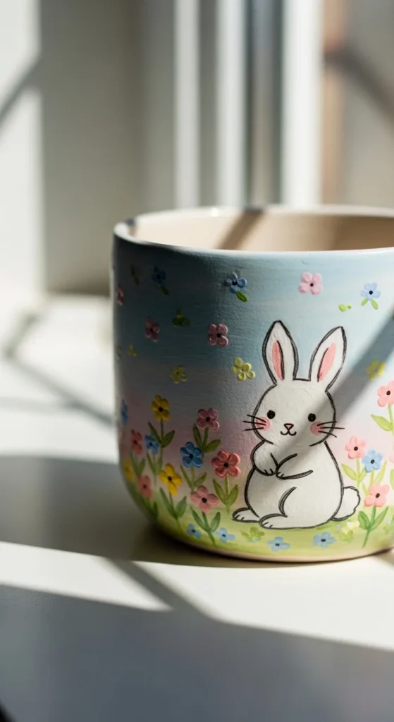 A storybook bunny planter feels sweet, playful, and a little nostalgic, making it a lovely choice for spring decor, nurseries, or gift ideas. The good news is that the bunny does not need to be realistic. A simple rounded shape with long ears, tiny eyes, and a small nose already creates a soft storybook look. Paint the planter in a pale pastel shade like blush, soft blue, cream, or mint, then add the bunny with a few tiny flowers, mushrooms, or leaves nearby. This project stays budget-friendly because soft pastel palettes usually use only a few colors, and the shapes are easy to repeat. It works especially well for small indoor plant pots, herb planters, or decorative containers on a shelf. If you are painting for a child’s room or a spring table setup, this design feels cheerful without being loud. You can paint one large bunny on the front or a whole little woodland scene around the planter. Keep the details simple and focus on the mood. A gentle face, soft colors, and a few tiny painted accents will do more than enough to make the piece feel charming and handmade.