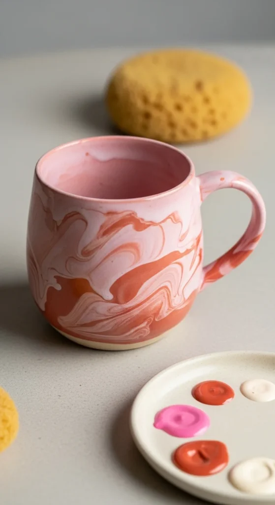 A soft marble swirl mug looks polished and artistic, yet it can be one of the easiest effects to create if you keep the colors limited. Choose two or three shades that work well together, such as blush and terracotta, blue and white, or sage and cream. Apply the paint in loose curved streaks, then lightly drag a brush or sponge through the color so the edges blur into a marble-like pattern. The aim is not perfection. The beauty comes from the random flow. This idea is affordable because you do not need tiny detail brushes or exact drawing skills. It is also great when you want something that looks more grown-up and modern than a themed design. A marbled mug fits well into neutral kitchen decor and makes a nice handmade present for adults who like calm, simple style. If you want a bolder look, try black and white. If you want something warmer, use clay tones and dusty pink. Keep the handle plain or add a single accent stripe there for a little extra detail. This is a good project for anyone who wants a stylish hand-painted ceramic piece without spending hours on small shapes.