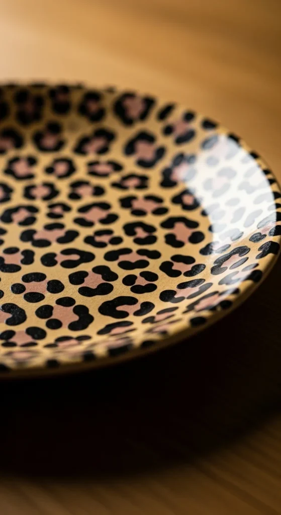 A big cat print plate is a fun option if you want something playful, bold, and full of personality. The pattern may look fancy at first, but it is really just a mix of uneven spots and curved marks, which makes it more forgiving than many people expect. Start with a warm base like beige, tan, or blush, then paint loose leopard-style shapes in dark brown or black. You can leave some open and fill others in to create that classic animal print feel. This project works well on plates, trays, or catch-all dishes and does not require special tools beyond a small brush. It stays affordable because you only need a few paint colors and the design covers the surface quickly. If you want to soften the look, use caramel and cream instead of sharp black. If you want something louder, add hot pink or rust into the pattern. This plate looks great on a vanity, coffee table, or shelf, and it can also be used as a jewelry dish. Keep the spots loose and uneven, because that handmade variation makes the print look more natural and stylish.