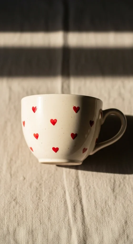 A tiny heart tea cup is one of the easiest pottery painting ideas for beginners, and it still feels sweet enough to gift or keep on display. Start with a cream, pale pink, or white cup and add small hearts in red, blush, burgundy, or even soft black. You can scatter them evenly around the whole cup or place them in small clusters near the rim and handle. Since hearts are simple shapes, this design is easy to do even if you do not feel confident with painting. It is also low-cost because the pattern uses very little paint and works with only one or two colors. This makes it a good choice for Valentine’s Day, bridal gifts, friendship sets, or a cozy tea station at home. If you want a more grown-up look, keep the hearts tiny and spaced out. If you want a cuter feel, mix large and small hearts together. You can also add a painted saucer with the same pattern for a matching set. A tiny heart cup feels handmade in the best way. It is simple, thoughtful, and useful, which is often exactly what makes painted pottery feel special.