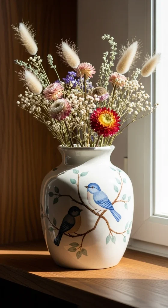 A blue bird vase has a gentle handmade charm that feels peaceful and easy to style in many rooms. Birds are a good motif because they can be painted in simple rounded shapes without much detail, yet they still make the piece feel expressive and special. Start with a pale or neutral vase and paint a few small blue birds sitting on branches with leaves or berries. Keep the bodies basic and use tiny dots or short lines for the eyes, wings, and tails. This idea is cost-friendly because it uses only a few colors, and the simple bird shapes make it beginner-friendly. It also works across seasons, which makes it a nice decor piece to leave out all year. A blue bird vase looks lovely with dried stems, garden flowers, or eucalyptus, and it also makes a thoughtful gift for someone who likes nature-themed decor. If you want a softer look, use dusty blue and gray. If you want a brighter version, add tiny coral or yellow flowers around the branches. Let the birds stay sweet and simple. The peaceful mood matters more than realism in this kind of design.