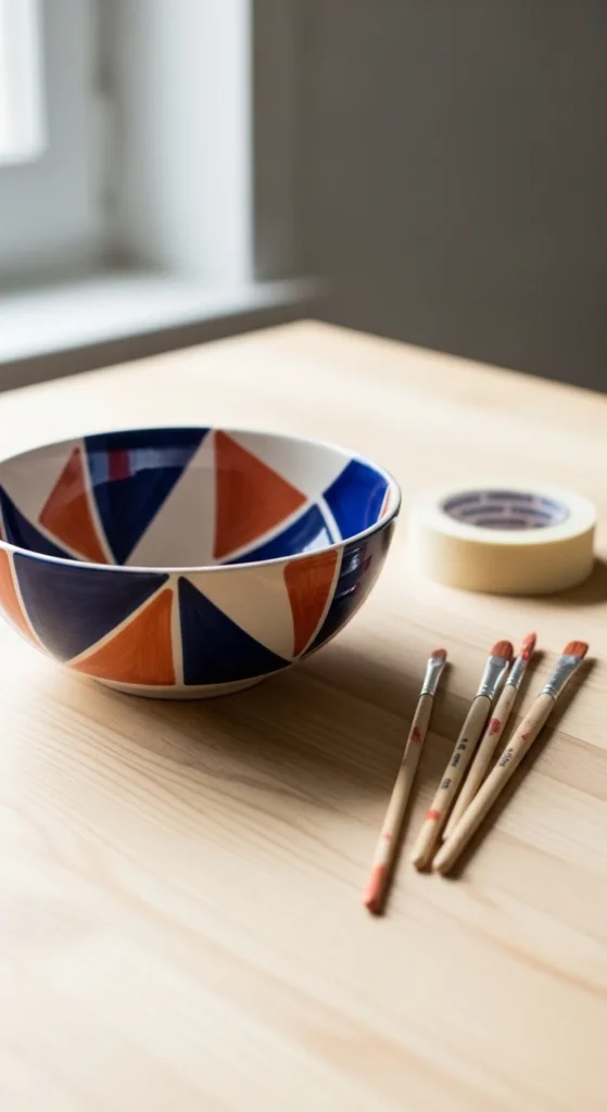 A geometric triangle bowl gives you a clean modern look without asking for advanced painting skills. The easiest way to make it is by using painter’s tape to section off the surface into triangles, stripes, or angled blocks. Once the tape is down, fill each area with one or two colors and let the shapes do the work. Navy, terracotta, mustard, black, and soft blush all look beautiful together. This is a great project for anyone who likes neat patterns but does not want to paint freehand flowers or detailed pictures. It also keeps costs low because tape acts like your guide, so you waste less paint and make fewer mistakes. Try painting only the outside of the bowl and leaving the inside plain for a simple look. Or flip it and put the pattern inside so the bowl feels like a surprise when used. This design fits well in a kitchen, office, or coffee table setup. If you want a more playful finish, mix tiny triangles with larger ones. If you want something calmer, stay with just two shades and repeat the same shape across the whole bowl.