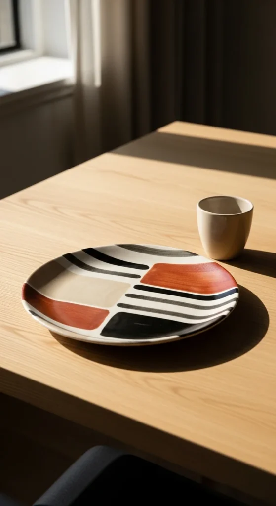 An abstract brushstroke plate is one of the easiest ways to make pottery feel artsy without painting any clear object or pattern. The whole idea is to use broad loose strokes, simple color blocks, and a little negative space to create a painted design that feels modern and relaxed. Choose two or three colors that work well together, like black, rust, beige, sage, or soft blue. Then add a few swipes, curves, or brush marks around the plate instead of filling the entire surface. This keeps the process simple and the result clean. It is also a good budget project because it uses very little paint and does not require detail tools. If you want the plate to feel more balanced, sketch where the main strokes will go before you paint. If you want it to feel freer, just paint slowly and stop before the surface gets too busy. These plates look lovely on open shelves, dining tables, or as small serving pieces. They also make a nice gift because abstract designs can match many home styles. Trust the shapes, keep the palette small, and let the brushwork stay loose.