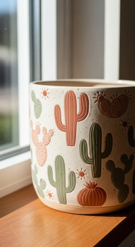 A desert cactus pot is a fun way to use earthy colors and simple shapes to create a ceramic piece that feels warm and playful. Cacti are very beginner-friendly because they can be painted as rounded vertical forms with tiny arms, little spikes, and perhaps a flower on top. Start with a base in cream, sand, or pale blush, then paint the cacti in olive, sage, or dusty green. Add tiny suns, dots, or terracotta lines if you want more detail. This idea stays low-cost because it only takes a few shades and works especially well on small planters or succulent pots. Once finished, it pairs perfectly with real cacti or low-care plants, which makes the painted design feel even more fitting. If you want a modern look, paint one oversized cactus on the front. If you want something more playful, add several small cactus shapes all around the pot. This project is also great for gifts because the final piece feels cheerful, useful, and easy to style. Keep the forms simple and the colors warm. That is often all you need to create a ceramic planter that feels handmade and full of character.