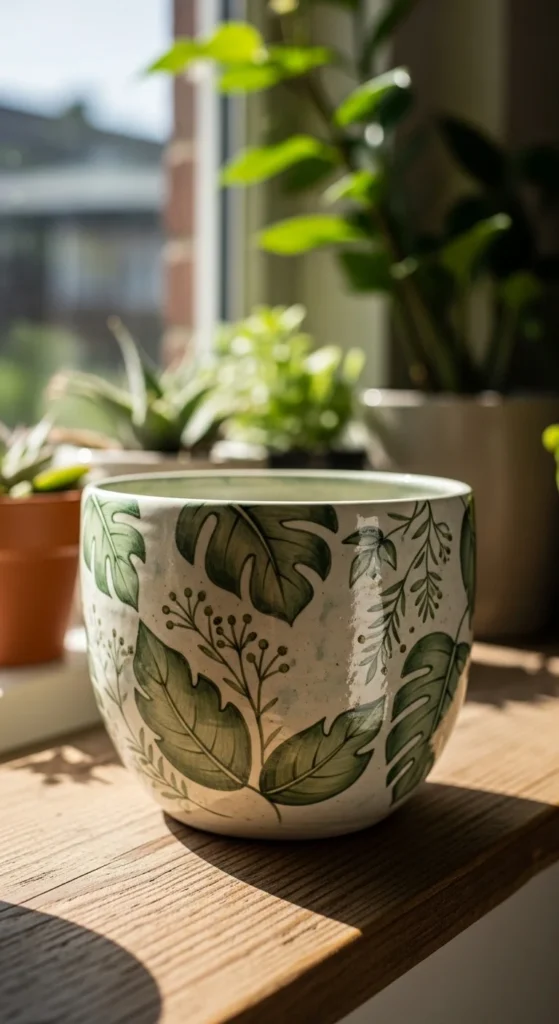 A botanical leaf planter is perfect if you want something calm, earthy, and easy to style around the house. Leaf shapes are forgiving, and even simple brushstrokes can look lovely once repeated around a pot. Start with a plain ceramic planter in white, sand, or pale gray, then paint leafy stems in sage green, olive, dark green, or muted blue. You can make the design loose and soft or a little more structured, depending on your taste. This project is also affordable because you only need one or two green tones and a medium brush. If you want more detail, add tiny line veins with a thin brush after the leaves dry. These painted planters look great in kitchens, bedrooms, or home offices, especially with herbs, pothos, or small succulents inside. They also make sweet housewarming gifts when paired with an inexpensive plant. Try wrapping the leaves all the way around or placing a few branches on one side for a quieter look. If you are painting with kids or friends, this is a great group idea because every planter can look different while still matching the same soft plant theme.