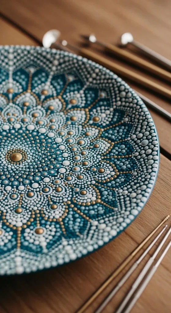 A mandala dot plate looks detailed and artistic, but it can be made one dot at a time with a cotton swab, pencil eraser, or dotting tool. This makes it a great option for people who want a wow-factor design without painting complex shapes. Start from the center of the plate and build outward in rings. Use dots in different sizes and repeat simple shapes like circles, petals, and tiny arches. Deep teal, navy, plum, rust, and white all work well for this style. It is budget-friendly because you do not need expensive tools, and even basic household items can make neat dots. If you are worried about symmetry, draw faint guide circles first. Mandala plates are beautiful as display pieces on shelves or walls, but they also make lovely serving plates for special snacks or table styling. If you want a softer look, use pale blue, blush, and cream instead of dark tones. If you want something bold, go with high contrast and tight dot spacing. The key is patience, not perfection. Slow repetition creates a design that feels calming to paint and rewarding to see once the whole pattern comes together.