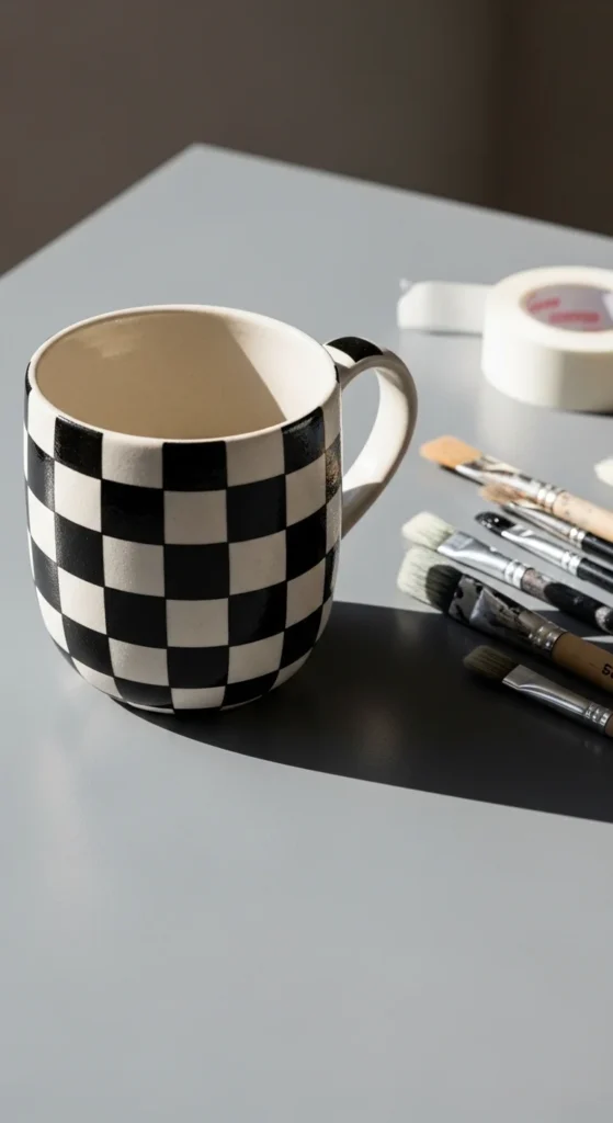 A checkerboard coffee mug has a fun bold look that feels trendy without being hard to make. All you really need is patience, a ruler, and painter’s tape or a careful hand. Start by dividing the mug into even squares, then paint alternating colors for that classic checker pattern. Black and white is the most striking choice, but muted beige and cream or sage and white can create a softer version. This is a great budget design because it uses basic shapes, so you do not need special art skills or fancy tools. It also works well if you want to paint a matching mug set for your kitchen or for gifts. You can paint the full mug in checks or just add the pattern to one side, the base, or the handle area. If you want to keep it more playful, make the squares slightly uneven for a handmade look. If you prefer something neat and graphic, use tape for cleaner edges. A checkerboard mug looks great in photos, on open shelving, and on a coffee station, so it is a nice mix of decorative and useful.