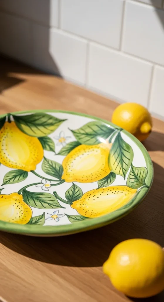 A lemon fruit bowl brings cheerful color into the kitchen and is one of the easiest painted food themes to try. Lemons are simple shapes, so you can make them with basic oval forms, a few leaves, and small branch details. A white bowl works beautifully because the yellow fruit pops against it right away. This project stays affordable because you mainly need yellow, green, and maybe a little blue or black for tiny shadows. If you want to keep it very easy, paint scattered mini lemons all over the outside. If you want a more styled result, create a repeating vine with lemons and leaves around the rim. This bowl looks lovely on a counter even when empty, but it is even better when filled with oranges, apples, or more lemons. It gives the kitchen a bright handmade feel without needing any hard painting steps. You can also do this same idea with strawberries, cherries, or oranges if lemons are not your style. Keep the shapes simple, use clear bright colors, and let the bowl feel playful. It is a great weekend project when you want something cute, practical, and easy to show off right away.
