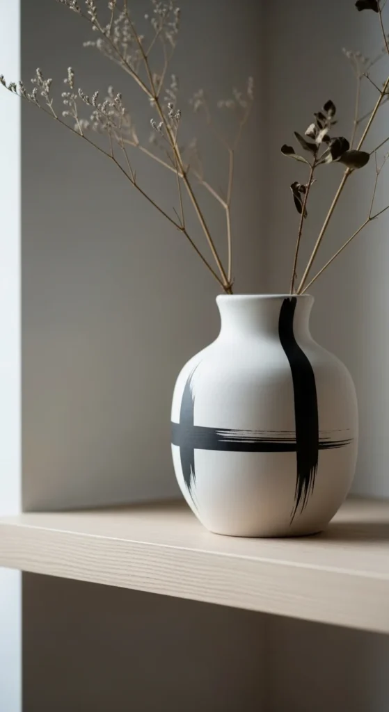 A minimal line art vase is a great choice if you like modern decor and want something that feels stylish without taking much time. This design works by keeping the background plain and adding only a few black or dark brown line details across the surface. You can paint abstract faces, curvy one-line shapes, arches, or simple leafy outlines. Because the design is so clean, every brushstroke stands out, which means you can create a polished look with very little paint. This also keeps the project affordable and low-mess. A white or cream vase works best because it gives the line work a sharp contrast. If you are nervous about drawing directly onto ceramic, practice on paper first with a thick marker. Once you find a shape you like, copy it onto the vase in one slow motion. These vases look beautiful with dried stems, eucalyptus, or even left empty on a shelf. They fit especially well in living rooms, bedrooms, and neutral home decor setups. Keep the design simple and resist the urge to fill every space. Empty areas are what make minimal painted pottery feel calm, clean, and expensive-looking.
