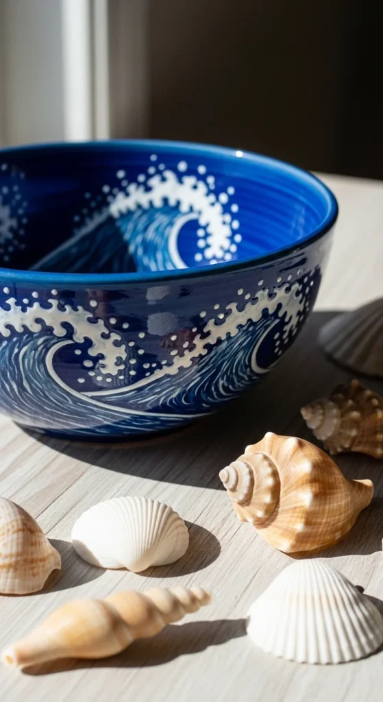 An ocean wave serving bowl brings a relaxed coastal feel into your kitchen or dining setup. Blue and white are the stars here, and you can keep the design simple by painting curved wave bands around the bowl. Add a few tiny foam-like brushstrokes in white or pale blue for extra movement. This is a smart project for beginners because waves do not need to look exact. A slightly loose hand often makes them look more natural. It is also cost-friendly because you only need a few shades of blue, white, and a medium brush. If you want a beach-inspired piece without painting detailed sea creatures or shells, this is an easy way to get that same calm feeling. The bowl looks lovely filled with salad, fruit, or even wrapped snacks on a table. If you want more texture, use a sponge very lightly to dab the white foam details. If you want a bolder style, paint only the inside of the bowl and leave the outside plain. This kind of pottery also makes a thoughtful summer gift because it feels handmade, useful, and tied to a peaceful seaside mood.
