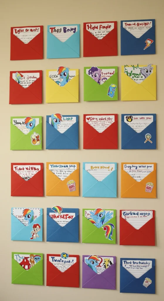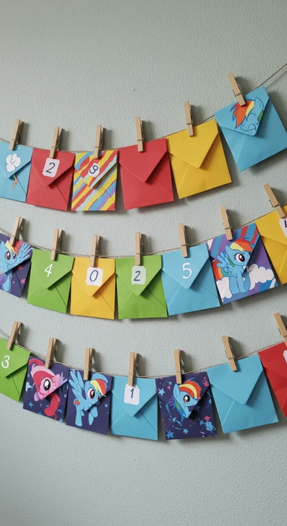 Envelope calendars are lightweight and affordable. Decorate 25 envelopes with Rainbow Dash stickers and glitter. Fill them with notes, coupons for activities, or small flat gifts like stickers. Hang them on twine across a wall for a festive garland. You can use dollar-store envelopes and colorful markers for decoration. Kids enjoy pulling one down daily, and it’s easy to personalize the surprises. This simple project adds charm to any room without taking up much space.