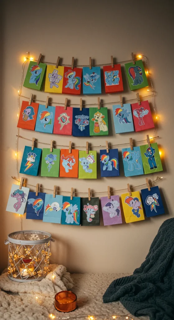 Gift bag calendars are a flexible and affordable option. Fill each bag with small toys, stickers, or candies, and number them with rainbow-colored markers. String them along a wall using clothespins and twine for a festive display. Kids enjoy choosing a bag each day, and parents can easily customize the surprises inside. Keep costs low by using simple paper bags from a craft shop and decorating them with Rainbow Dash cutouts. Add glitter tape or metallic bows for extra sparkle. It’s easy, cheerful, and creates a colorful display that doubles as wall décor.