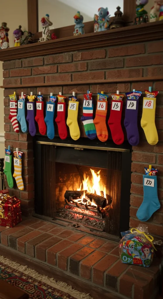 Tiny stockings bring warmth to Advent calendars. Hang 25 miniature stockings on a mantel or wall. Fill each with candy, stickers, or small toys. Label them with rainbow numbers for a magical effect. You can buy inexpensive stockings or sew your own using fabric scraps. Add extra sparkle with glitter glue or sequins. Kids love pulling out little surprises each day. The display also makes the room feel cozy and festive. This idea works well for families who enjoy traditional holiday décor with a playful twist.