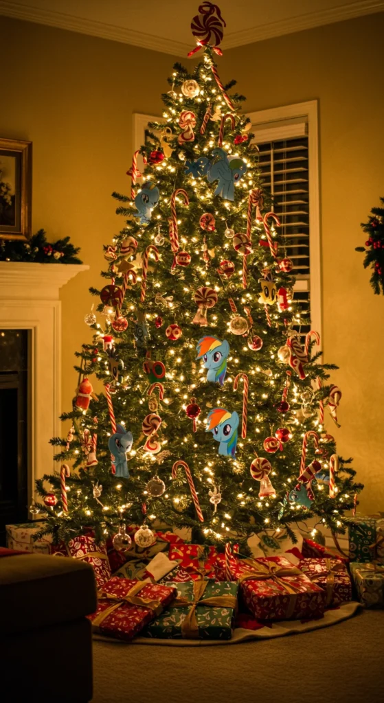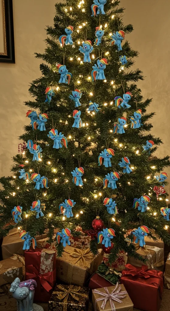 Ornament countdowns bring joy to both the calendar and the tree. Each day, kids hang a new Rainbow Dash ornament on the branches. You can buy inexpensive My Little Pony figurines and add hooks, or craft paper versions with glitter. Store each ornament in a numbered envelope or box. The fun grows as the tree fills up with colorful ponies. Parents can mix in candy canes or small stars to balance the look. By Christmas Eve, the tree is bright and filled with rainbow magic.