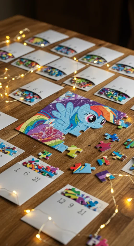 Puzzle calendars are interactive and rewarding. Print a large Rainbow Dash puzzle image and divide the pieces into 25 sets. Each day, kids open an envelope and add to the puzzle. Watch their excitement as the picture comes together closer to Christmas. You can find inexpensive puzzles online or print and laminate your own. Store each set in decorated envelopes or paper bags. This option is low-cost but highly engaging. By Christmas Eve, the completed puzzle feels like a big surprise.