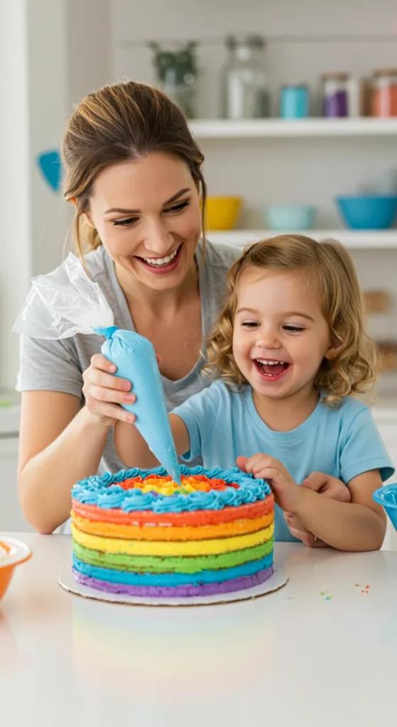 Once your masterpiece is ready, it’s time for the best part sharing it! Watch your kids’ faces light up as you cut into the cake and reveal the rainbow inside. The colors, the sweetness, and the excitement combine into one unforgettable celebration moment.