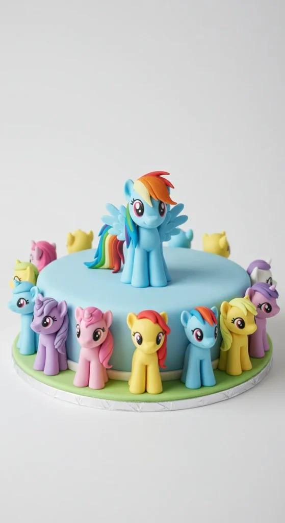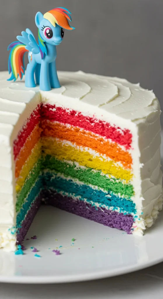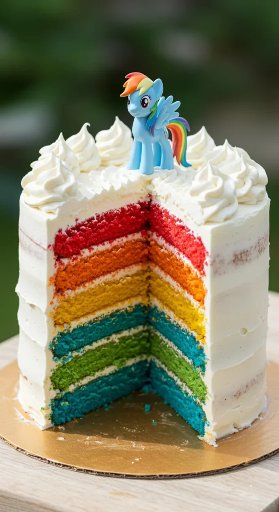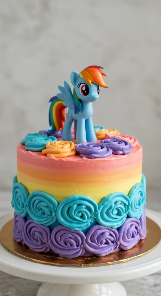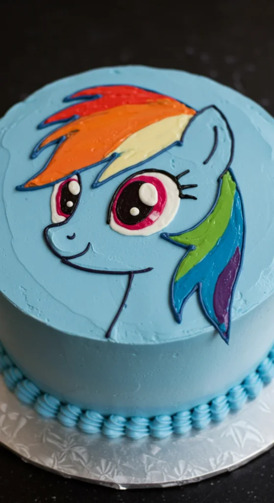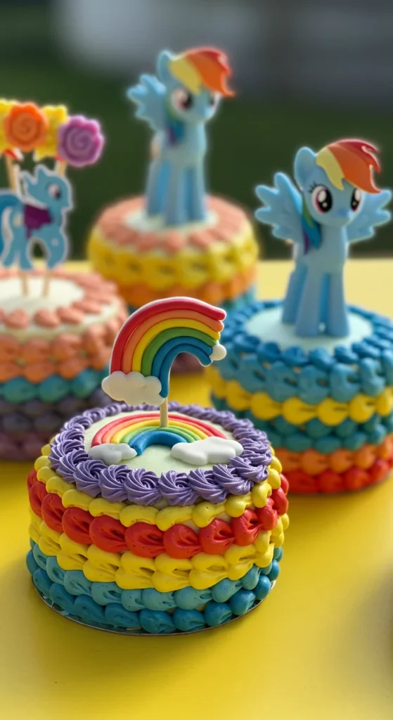 For younger birthdays, a smash cake is always fun. Keep it small, with just two or three layers, and cover it in bright rainbow colors. Add a Rainbow Dash topper to complete the look. Babies love smashing into the cake, and parents can take memorable photos. It doesn’t need to be perfect—simple swirls of colorful frosting make it festive enough. Since the cake is small, you can make it at home without much effort. Keep the frosting soft and easy to smash for those adorable messy moments.