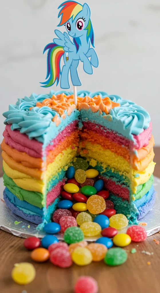 A piñata cake surprises everyone. Bake a hollow center inside the cake and fill it with colorful candies or sprinkles. Cover the outside with rainbow frosting and add Rainbow Dash on top. When cut open, the candy spills out, exciting kids and guests. This design is budget-friendly since you only need basic candies. The hollow can be made easily by cutting out a circle in the middle before stacking layers. Kids especially love the surprise element, making it a fun interactive cake idea for birthdays.