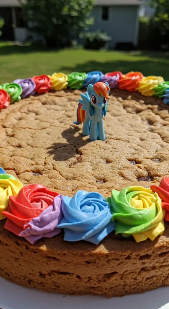 A cookie cake is a fun alternative if baking a layered cake feels too much. Use a giant cookie base, frost it with rainbow-colored icing, and place a Rainbow Dash decoration in the center. You can make it at home with one big round pan and cookie dough. It’s budget-friendly and easy for those who prefer not to handle multiple layers. Kids love the mix of cookie and cake. You can even add rainbow chocolate chips into the dough for extra fun.