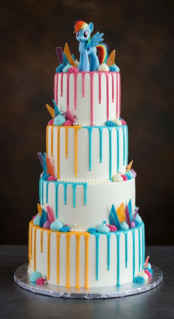 A chocolate drip cake with rainbow colors always makes an impression. Start with a frosted cake, then drip melted candy melts or colored ganache down the edges. Use different colors to create a rainbow effect. Add Rainbow Dash on top to finish the look. This cake works well with both homemade and store-bought sponges. It feels festive without requiring expert skills. The drip technique is forgiving and budget-friendly since it uses simple candy melts. Kids enjoy the playful effect, making it perfect for birthday celebrations.