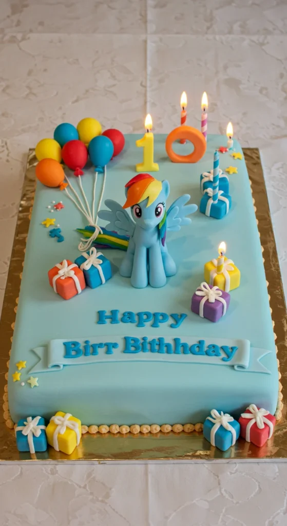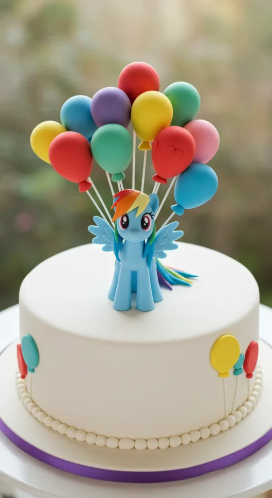 A balloon-themed cake highlights Rainbow Dash’s fun side. Use fondant or buttercream to make colorful balloon shapes on the cake. Add strings with piped icing and place Rainbow Dash holding the balloons on top. This design looks cheerful and works for birthdays of any age. Fondant balloons can be cut easily with cookie cutters, keeping costs low. You can even make edible balloon lollipops with melted sugar for a DIY twist. Kids love the playful vibe, and it adds an extra burst of color to the party table.