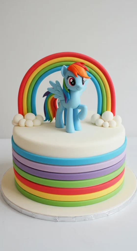 A fondant rainbow cake gives a structured, neat look. Use fondant strips to create a standing rainbow arch across the top of the cake. Place Rainbow Dash beneath the arch to make it look like she’s standing in her element. This design can be made at home with basic fondant tools and food coloring. If fondant feels tricky, you can substitute with rainbow candy belts or icing pipes. It’s a striking centerpiece that feels festive while staying budget-friendly with simple homemade touches.