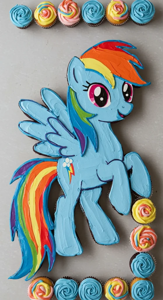 A pull-apart cupcake cake combines cupcakes with a big cake look. Arrange cupcakes in the shape of Rainbow Dash, then pipe frosting over them to connect the design. Kids can grab a cupcake without cutting into the cake. It’s easy for parties with lots of children. The design may look advanced, but it only requires arranging and piping. Using cupcakes saves money since you only need one big batch of batter. It also avoids needing plates or forks, making serving effortless.
