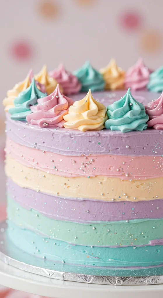 A glitter cake shines beautifully under party lights. Cover the cake in pastel rainbow frosting, then sprinkle with edible glitter. Add a Rainbow Dash topper for the final touch. This style looks magical and requires minimal effort. You can use store-bought edible glitter for under $5, making it budget-friendly. Pair it with a plain sponge to save time. Guests love the sparkle, and it photographs well for birthday memories. It’s a simple but fun way to bring Rainbow Dash’s energy to life.