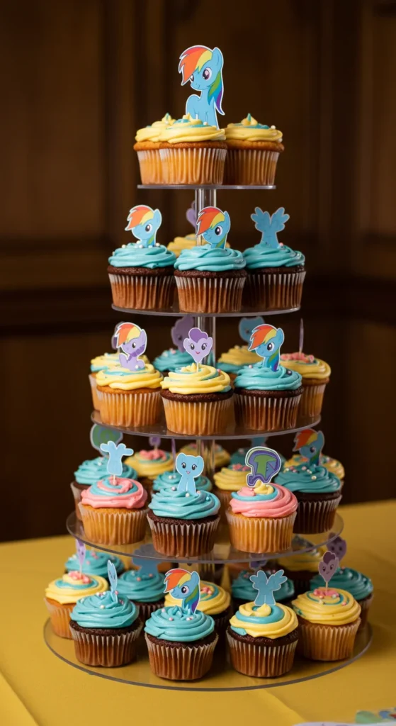A cupcake tower gives everyone their own mini cake. Bake plain vanilla or chocolate cupcakes and top them with rainbow-colored swirls of frosting. For extra fun, place a small Rainbow Dash decoration on a few cupcakes. Arranging them on a tiered stand creates a centerpiece without needing one large cake. Cupcakes are budget-friendly because you can make them at home in bulk. Kids also love picking their own design. Mix gel food coloring into buttercream to make swirls of red, orange, yellow, green, blue, and purple. This idea is both fun and practical for serving large parties.