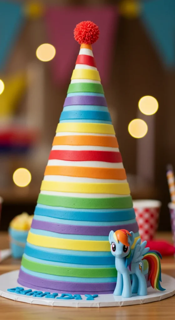A party hat cake is playful and creative. Bake the cake in a tall cone-shaped pan, then decorate with rainbow stripes of buttercream or fondant. Place a Rainbow Dash figurine at the base to complete the look. This cake is fun for kids who love the idea of a giant party hat as dessert. It’s affordable since the decorations only require food coloring and piping bags. Adding a pom-pom made of frosting at the tip adds extra charm. This design always feels cheerful at birthday parties.