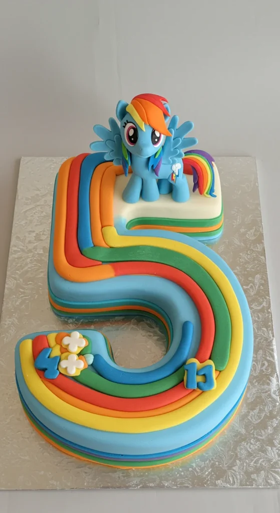 A number-shaped cake is perfect for celebrating birthdays. You can bake the cake in a sheet pan, then cut it into the birthday number. Cover it with buttercream, then decorate each section with rainbow stripes to mimic Rainbow Dash’s mane. Add small edible stars or sprinkles for extra flair. If you’re not confident with fondant, use a Rainbow Dash toy topper instead. This option feels personal because it ties the cake directly to the child’s age. It’s also budget-friendly since the shape can be made at home with a basic knife and template.