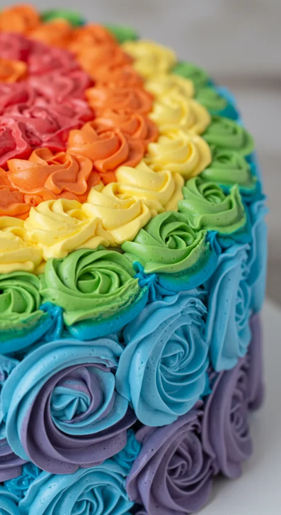 A surprise inside cake excites guests when cut open. Bake sponges in different rainbow colors, then stack them in a striped or checkerboard pattern. Frost the outside simply with white buttercream. From the outside, it looks plain, but when sliced, the rainbow inside is revealed. This idea is budget-friendly since it only requires food coloring and time to layer. Kids are always amazed at the hidden rainbow. It’s a simple way to bring color without complicated decorating.