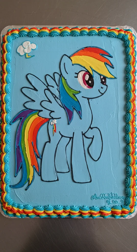 A sheet cake is straightforward and perfect for serving large groups. Use a rectangular pan, frost it with white icing, and then draw Rainbow Dash using colored piping bags. Even if the design is not professional, kids will recognize their favorite pony. Add rainbow borders along the edges for extra flair. This style is easy for beginners and saves money since it only requires one pan and minimal stacking. You can also use edible printed images of Rainbow Dash if freehand drawing feels difficult. Sheet cakes are always practical for parties with many guests.