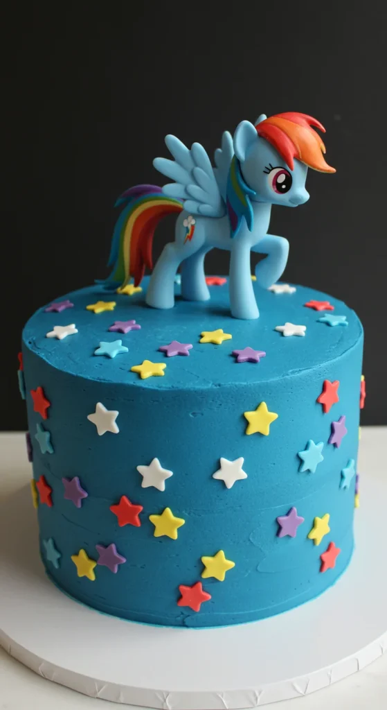 A starry sky cake captures Rainbow Dash’s adventurous spirit. Cover the cake in dark blue buttercream, then add edible stars or silver sprinkles. Place a Rainbow Dash figure at the top, flying through the sky. This cake feels dramatic but is simple to make. Food-safe glitter dust can add sparkle without costing much. A single color base means less time mixing frosting shades. It’s also easy to make at home with one large round pan. Kids love the magical look, and it photographs beautifully at parties.