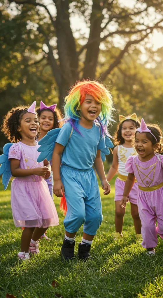 Group costumes make events more fun. Rainbow Dash stands out when paired with friends dressed as other ponies. The outfit can be simple: blue shirt, rainbow wig, and wings. The group idea spreads costs since each child uses basic pieces. This is ideal for siblings or friends wanting a theme together. Fun, colorful, and memorable for parties or school plays.