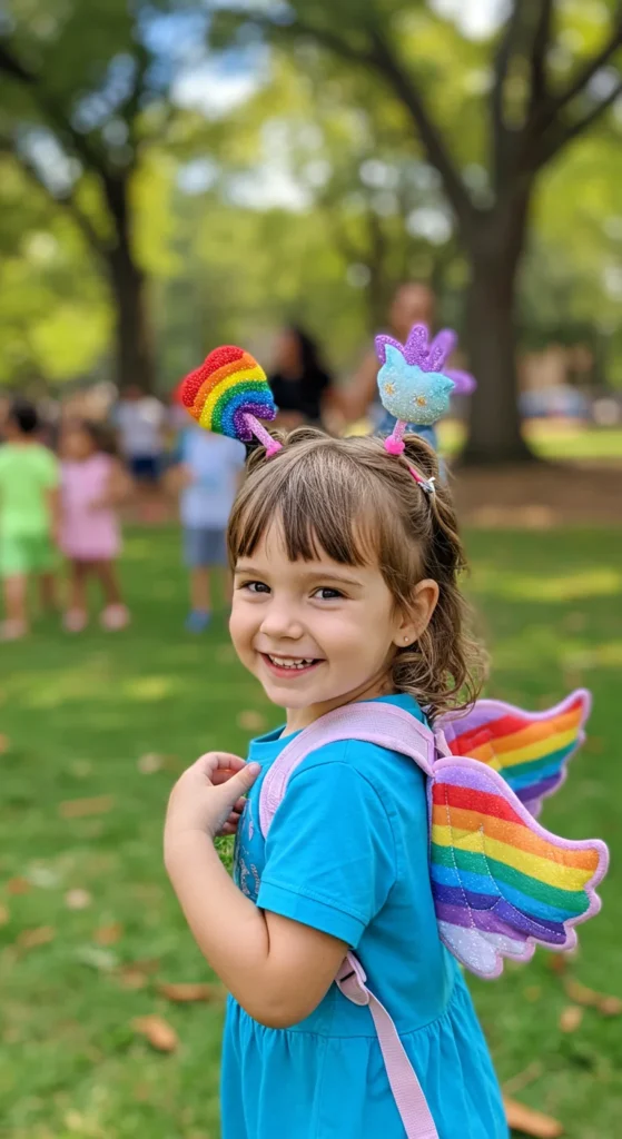 A simple cotton dress paired with rainbow leggings makes a practical costume. Add a headband mane and small wings for effect. This is great for school-friendly events since it’s easy to move in. Parents can reuse rainbow leggings as regular wear after the event, making it a cost-saving idea. Comfortable, colorful, and lightweight, this costume works well for kids who dislike heavy outfits.