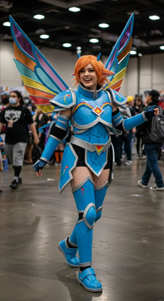 For cosplay lovers, Rainbow Dash can be taken to the next level with armor-inspired outfits. Think blue foam armor pieces with rainbow trims, paired with large wings. A styled rainbow wig completes the look. While this version requires more crafting time, it’s still budget-friendly if you use EVA foam or cardboard. Tutorials online can guide step-by-step for building lightweight armor. This style works best for conventions or cosplay events. It adds a bold twist to the playful pony while still keeping the fun colors.