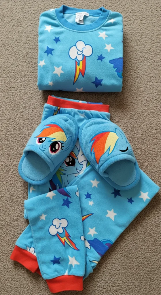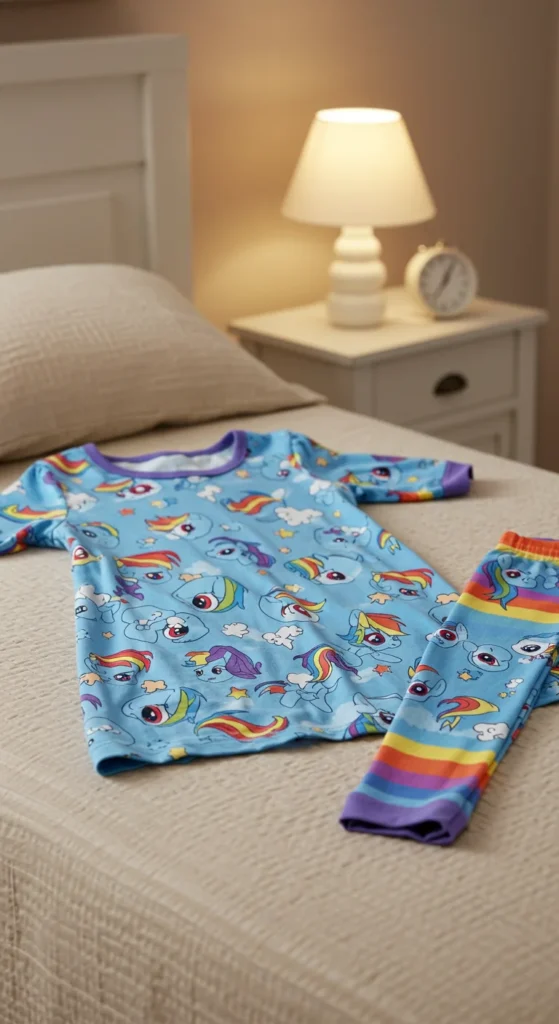 A classic Rainbow Dash pajama set is perfect for everyday wear. The cotton fabric feels soft and breathable, making it a great option for warm nights. These sets usually include a short-sleeved shirt with a fun Rainbow Dash print and matching pants. Parents can find affordable options at local stores or online marketplaces. If you want to save money, buy slightly larger sizes so the pajamas last longer as your child grows. Adding playful socks or slippers can also make bedtime more enjoyable without spending too much.