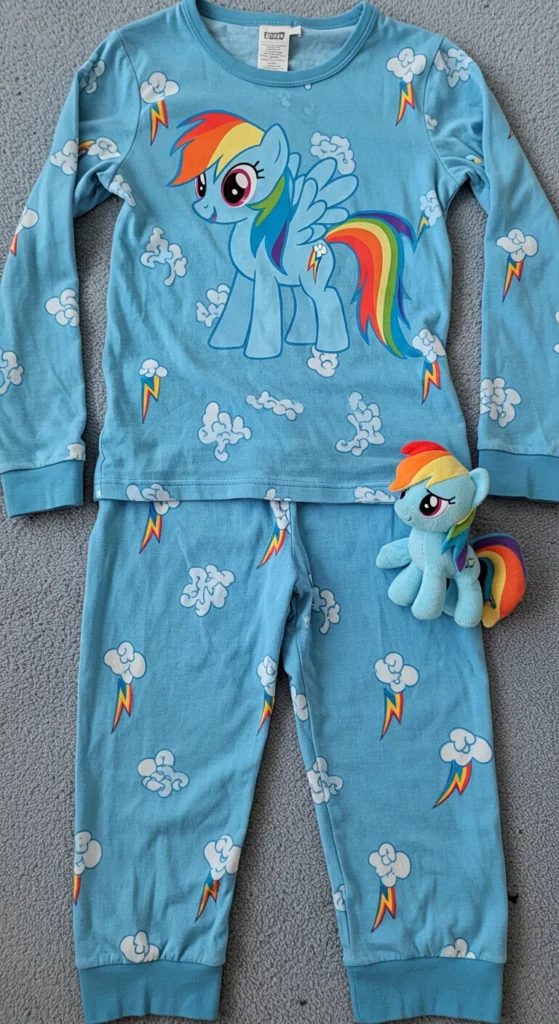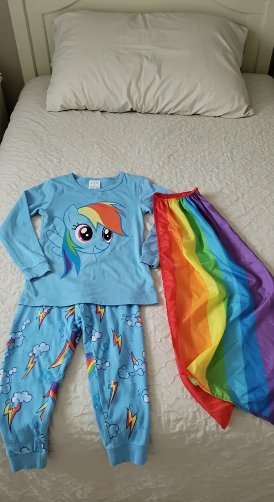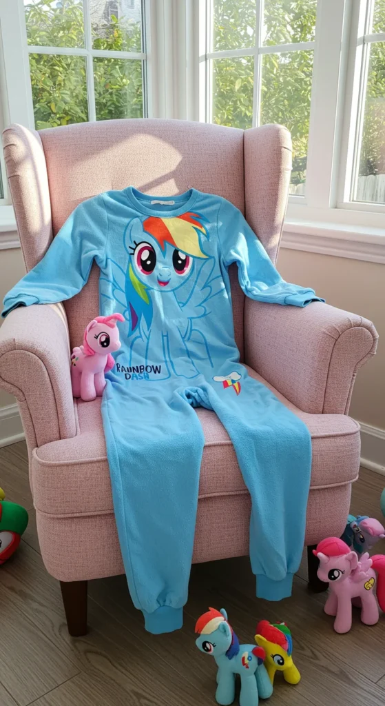 Hooded Rainbow Dash pajamas bring extra fun to bedtime. The hood often includes small ears or rainbow accents, making kids feel like they’re part of a playful costume. These pajamas are popular for both sleeping and lounging around the house. Parents find them practical in colder weather since the hood adds warmth. Buying during clearance sales makes them more affordable. Kids enjoy pretending to be their favorite character while still feeling cozy. Parents can encourage imaginative play by creating a short bedtime story around the Rainbow Dash theme.