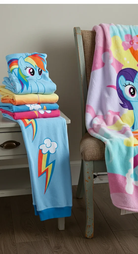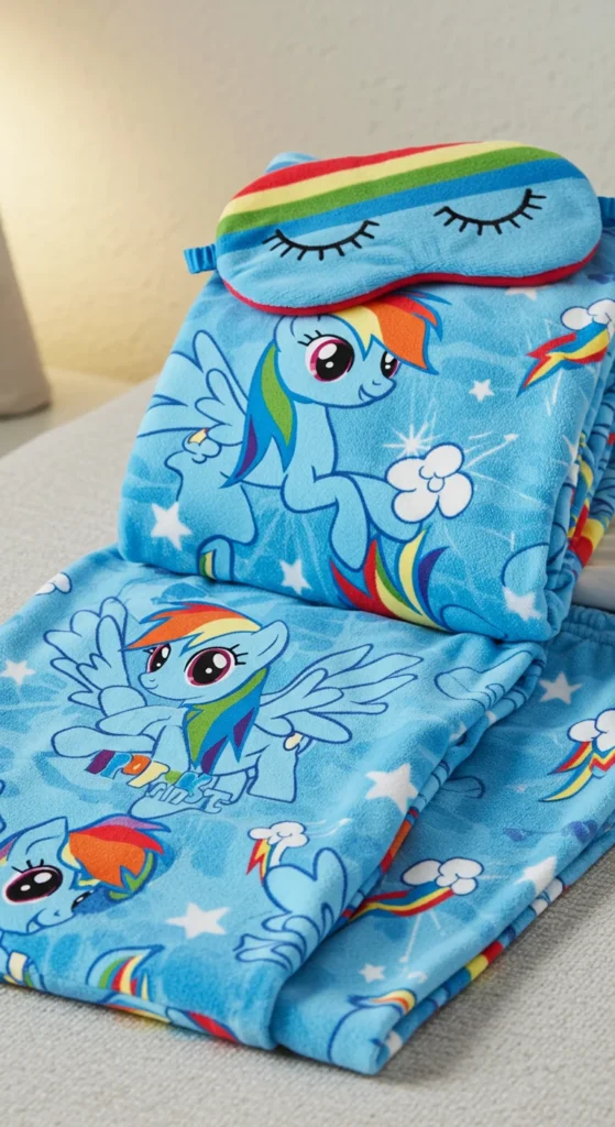 A pajama set with a matching blanket creates a cozy theme for bedtime. Kids feel extra comfortable when their pajamas and blanket share the same design. Parents appreciate these sets for their practicality during colder months. Buying bundles often saves money compared to purchasing separately. A DIY option is to add Rainbow Dash patches to a plain blanket to match the pajamas. Kids love snuggling into bed when everything looks coordinated. These sets are also perfect gifts for birthdays or holidays. The combination brings warmth and fun together, making bedtime more enjoyable.