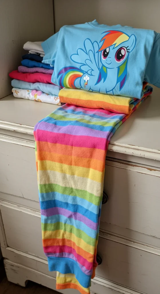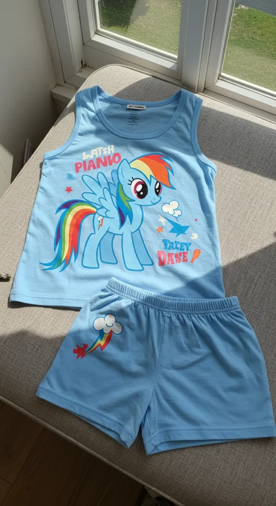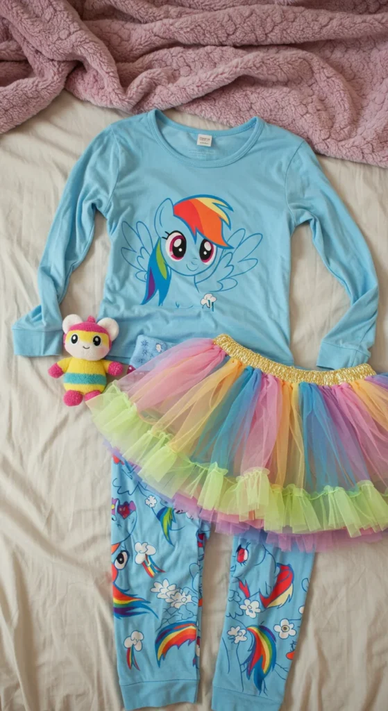 A pajama set with a tutu skirt adds magic to bedtime. Kids love the dress-up feel, twirling before climbing into bed. Parents find them great for themed parties as well as sleepwear. These sets are often sold at affordable prices in children’s stores. A DIY version can be made by pairing a Rainbow Dash top with a simple tulle skirt. The tutu makes bedtime feel like a mini celebration. Washing the skirt separately keeps it fluffy and lasting longer. Pajamas with tutus combine fun, imagination, and comfort in one outfit.